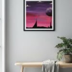In this poignant work, the artist explores the heavy relationship between where we come from and where we are going. Consequences presents a striking silhouette against a vibrant, tiered sunset of magenta and violet. The narrative centers on a towering figure reaching down to lift a small creature, while a silent tomb rests beneath the singular, clouded tree. The presence of the tomb introduces a layer of “living memory” to the piece. It suggests that the act of rising is often born from loss or the passing of time. The golden light of the horizon represents the future, while the dark earth and the monument below represent the roots of our story. This is a meditation on the consequence of survival: the beautiful, difficult necessity of moving upward while leaving a piece of our history behind. “To rise is a choice; to remember is a consequence.”
