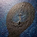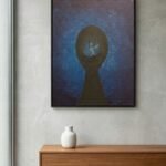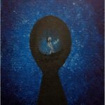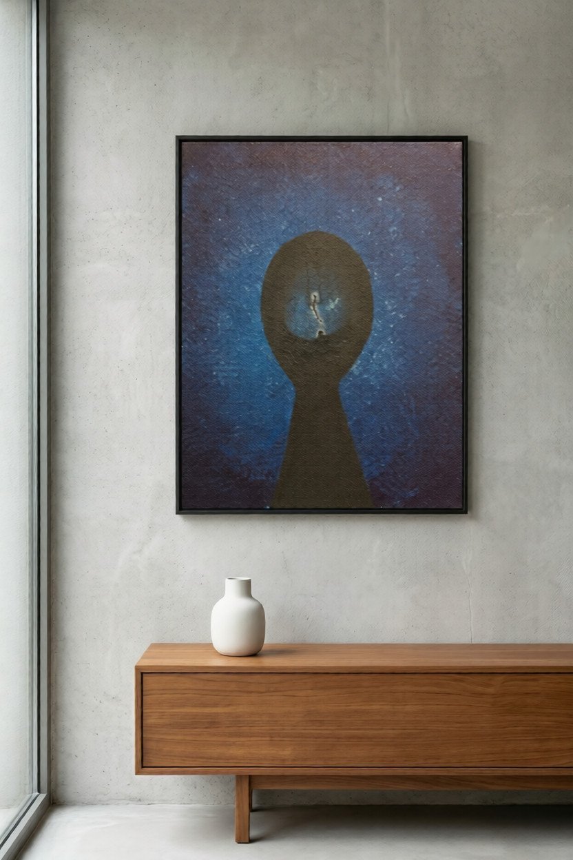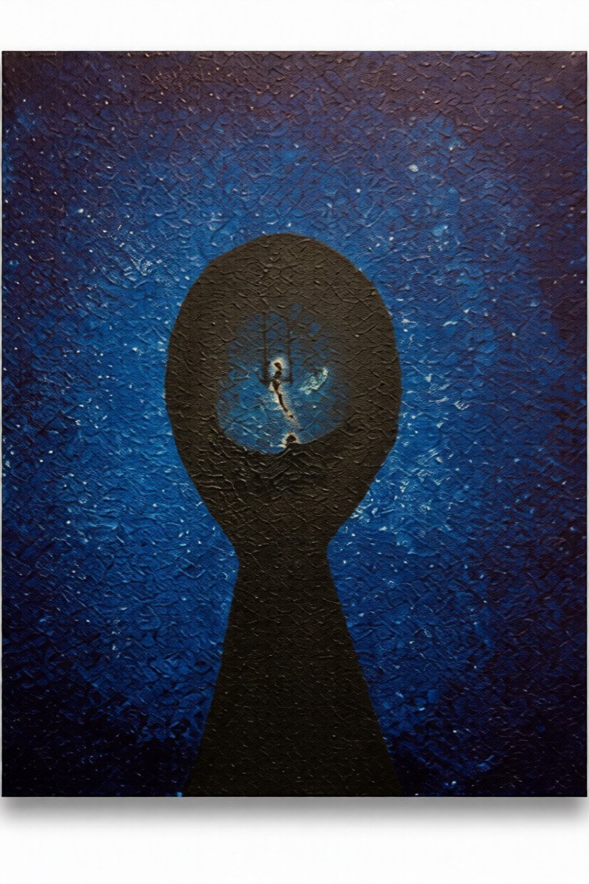 In Childhood Nightmare, the artist delves into the architectural nature of fear—how it can feel like a solid, inescapable structure. The composition is dominated by a massive, keyhole-shaped silhouette of absolute black, which acts as both a frame and a prison. This central void is set against a stippled, midnight-blue atmosphere that suggests a cold, vibrating energy, like the static of a dream that refuses to end. At the very heart of the dark aperture, a singular, skeletal-thin figure is suspended. Caught in a state of perpetual falling or frozen waiting, the figure is dwarfed by the immense weight of the surrounding shadow. The work captures the specific, primal terror of being small in a world that feels impossibly large and indifferent. It is a meditation on the memories that haunt the back of the mind—the “rooms” of our past that we still carry within us, even when the lights are on. “A door left slightly ajar in the mind, revealing the quiet, heavy shapes of the things we once feared in the dark.”